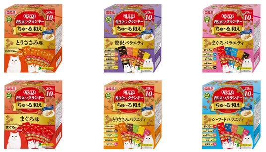 ・20g×10袋入りで、「まぐろ味」「とりささみ味」「まぐろバラエティ」「とりささみバラエティ」「シーフードバラエティ」「贅沢バラエティ」の6タイプ。