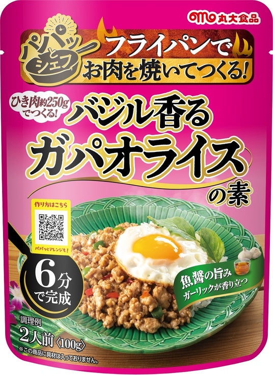 パパッとシェフ バジル香るガパオライスの素魚醤の旨みとガーリックが香り立つ味わいに仕上げたガパオライスの素です。爽やかなバジルの風味も優しく香ります。