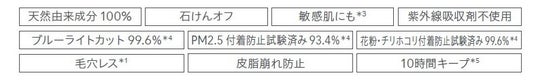 *1:使用感として *2:メイクアップ効果による *3:敏感肌パッチテスト済み。すべての方に皮膚刺激が起こらないとい うわけではありません。 *4:第三者機関実施試験結果より *5:紫外線・ブルーライト*⁴・近赤外線*⁴ *6:ハッカ葉油(香料) *7:レモン果皮油(香料) *8:ハッカ葉油、レモン果皮油(香料) *9:UVプロテクションベースS