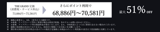本サービスの価格は「THE GRAND HOTEL COLLECTION(ザ グランドホテル コレクション)」の定価で1泊当たり73,886円~75,581円(消費税、サービス料込)と一般的な宿泊予約サイトと比べて割安となっていますが、さらにLINE会員登録をしていただいた方へ5,000円分のポイントをプレゼントいたします。よって同ポイント利用後では68,886円~70,581円という値段でお買い求めが可能です。同価格は2025年2月5日時点における、本サービスの宿泊対象期間中のホテルの販売価格から最大51%オフとなっています。