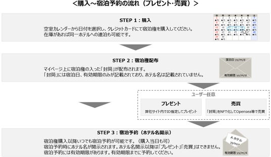本サービスは夏休み時期の2025年6月1日から2025年8月31日までの日程を販売します。ユーザーは空室カレンダーよりご自身の都合に合わせて日程を選択(1泊単位)し、クレジットカードで購入をしていただきます。在庫次第ではありますが、同一ホテルへの連泊も可能です。ホテルに関しては上記3つの中から抽選で選ばれます。上記以外のホテルが当たることはありません。購入から宿泊予約の流れに関しては下記図をご参照ください。