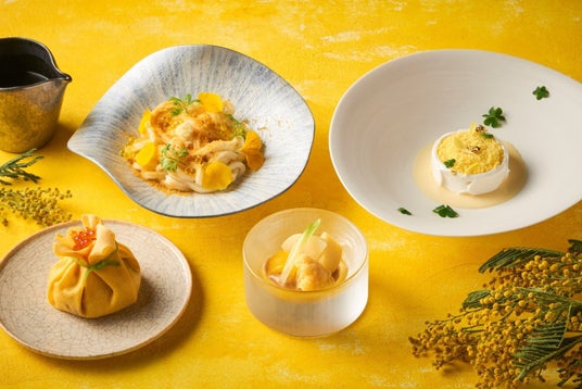 今回ご提供するメニューは、女性のエンパワーメントとジェンダー平等の社会実現をテーマに掲げるHappy Womanの理念に共感し、すべての方に楽しんでいただけるメニューとして考案いたしました。ミモザの花をイメージした、黄蕪や唐墨、薄焼き卵など、自然の彩りを活かした鮮やかなイエローの食材をふんだんに使用し、気持ちまで明るくなるような一皿に仕上げました。「唐墨うどん」や「茶巾寿司」など、伝統的な和食の技術に料理長・天田内の遊び心を加えたランチセットをぜひご堪能ください。