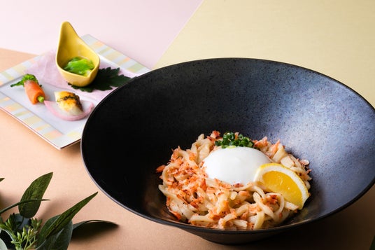 【花咲くカルボナーラ風うどん】エディブルフラワーなどを散りばめて、春のお花畑を連想させるよう可愛らしく仕上げました。