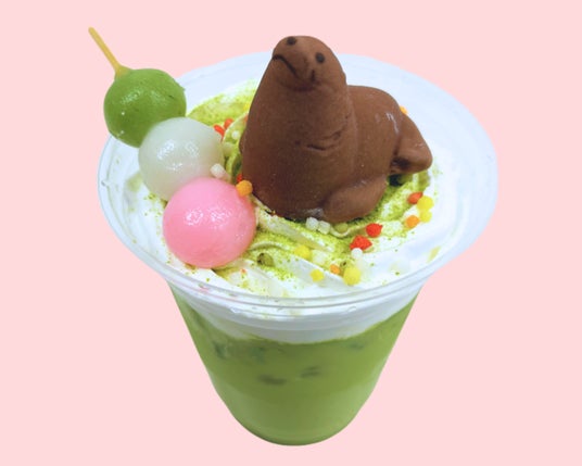 内容:抹茶ラテにホイップクリーム、三色だんご、あられ、愛らしい「オットセイ」のマシュマロをトッピングした限定ラテ。