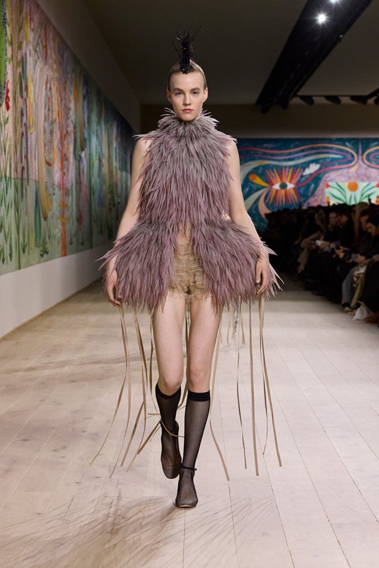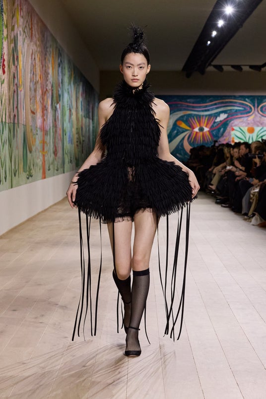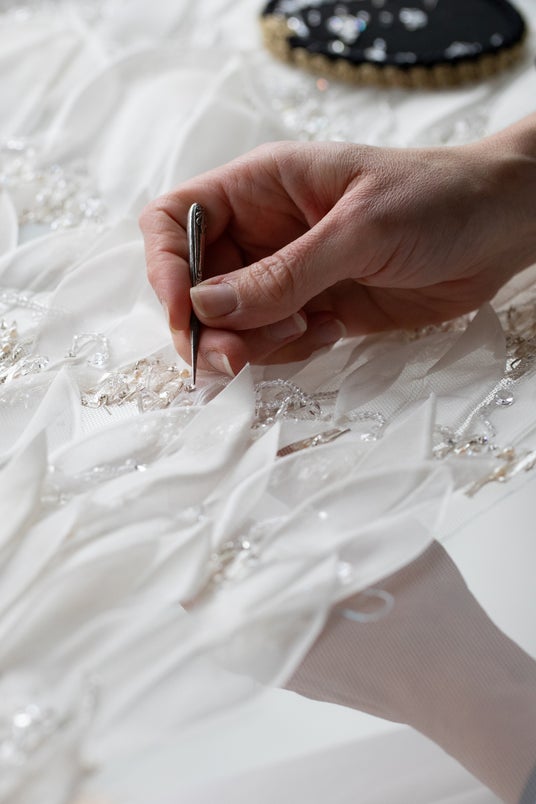 2025年春夏オートクチュール コレクションに登場した花びらのようなドレスは19世紀の技術を引き継ぐ職人による精緻な手作業によるものです。ドレスを制作するにあたり、シルクオーガンザで作られたフェザーは一つ一つ手作業で塗装され、19世紀当時から使用される伝統的な道具を使って成形されます。アトリエ メゾン ルサージュでは、ラフィアとセロファンが刺繍で施され、小さなビーズやタッセルが配置されて複雑で美しい渦が作られます。その後、メゾン ルマリエの工房で花びらのケープが作成されます。花びらの層を使ったフェミニンなドレスは透明かつ軽やかで、ポエティックで夢のような魅力を持つ仕上がりとなりました。