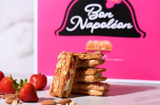 お菓子の王様「ナポレオンパイ」の愛称で呼ばれるいちごのミルフィーユをイメージした焼菓子です。さわやかな酸味が特徴のホワイトチョコクリームとフリーズドライの苺を、バターが香るサクサクのパイ生地でサンドしました。上品な甘さのざらめ糖とアーモンドで着飾った「かわいらしい皇帝(ボン・ナポレオン)」をぜひお召しあがりください。