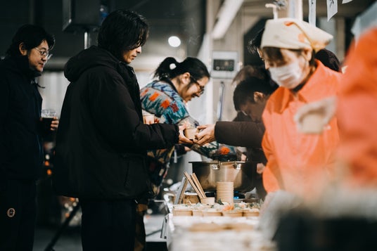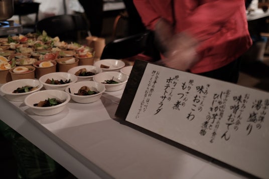 初日の最後はレセプションを開催しました。FUJI TEXTILE WEEK 実行委員会会長/アート展ディレクター 南條史生による挨拶ののち、地元の女性たちや地域の飲食店から届けられた郷土料理、日本酒、富士山麓で採取したハーブティなど、食からも富士吉田の地域性を感じていただけるよう工夫を凝らし、アットホームな雰囲気で、参加者同士の会話も弾んでいました。