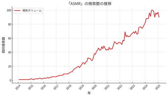 <図1>検索ワード「ASMR」の検索数の推移(Googleトレンドの2025年2月10日時点でのデータより作成、最大値を100として正規化したグラフ)