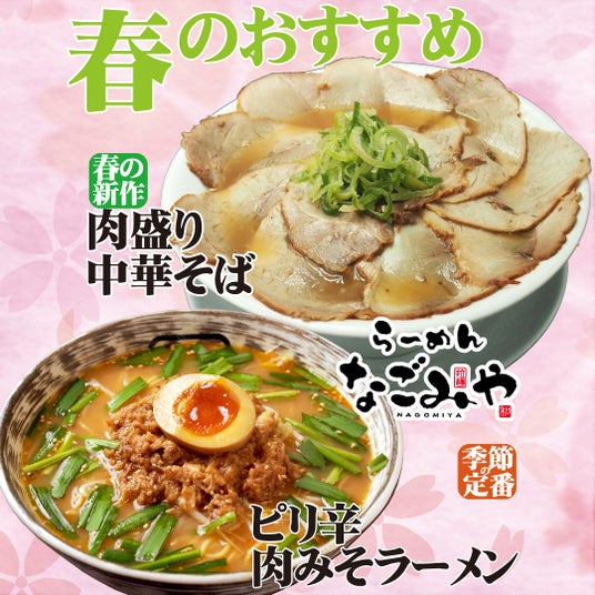 【らーめんなごみや】から春限定【肉盛り中華そば】、季節限定【ピリ辛肉みそラーメン】が登場いたします。