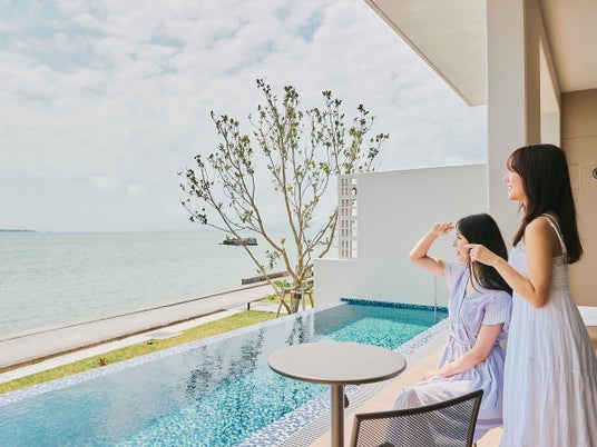 全客室50m²以上のオールスイートルーム。全室キッチン、各種家電、Wi-Fi完備。OceanWingの1階客室にはプライベートプールを完備。