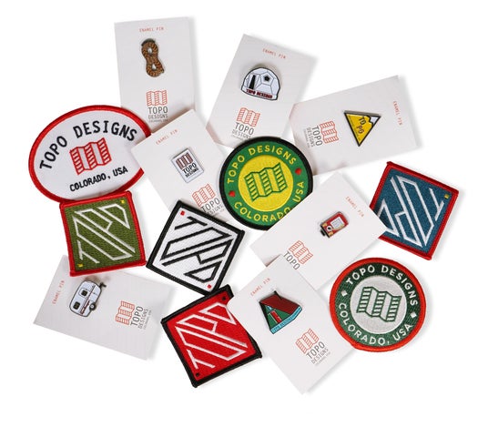 ノベルティはピンバッジとアイロンワッペンをご用意。詳しくは、TOPO DESIGNSオンラインストアをご覧ください。