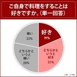 自炊をどのくらいの頻度でしているのかについては、「ほぼ毎日」が全体の約3割。週に1日以上自炊している人が多数ではある一方、ほとんどしない「それ以下の頻度」と回答した人も5人に1人以上いました。自身で料理をすることが好きかどうかという質問では、「好き」と「どちらかというと好き」を合わせると50.1%、「嫌い」と「どちらかというと嫌い」を合わせると49.9%となり、「好き」派と「嫌い」派が二分化しました。