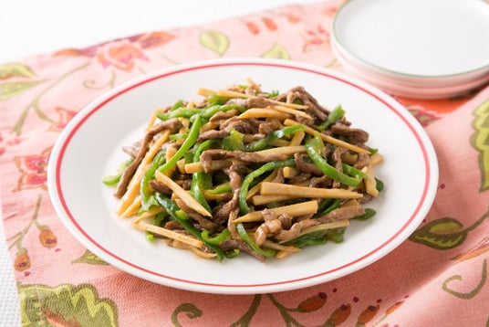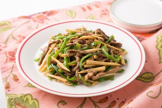 牛肉、ピーマン、たけのこを細切りにし、フライパンにごま油、にんにく、しょうがと炒めます。オイスターソースを中心とした合わせ調味料を作り、混ぜ合わせたら完成です。