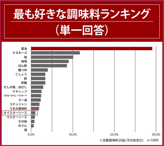1.好きな調味料 1位「醤油」、2位「マヨネーズ」、3位「塩」 「オイスターソース」は16位…。