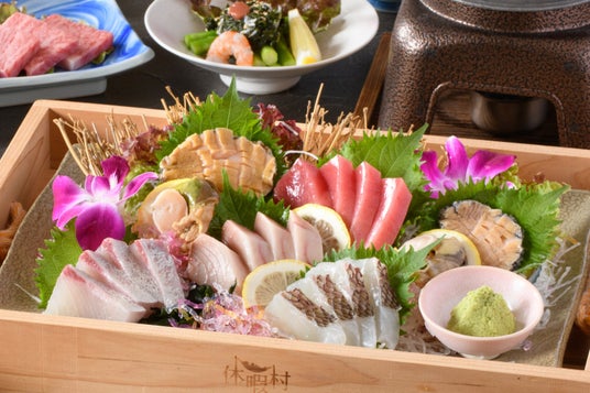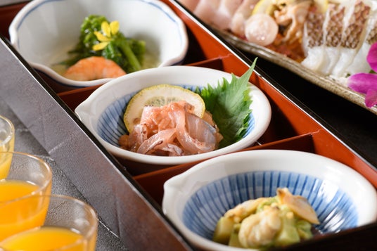 休暇村瀬戸内東予のイチ押し魚介「媛スマ」と「だてまぐろ」はお造りで、豊富なバリエーションを持つ柑橘類はジュースでご用意しました