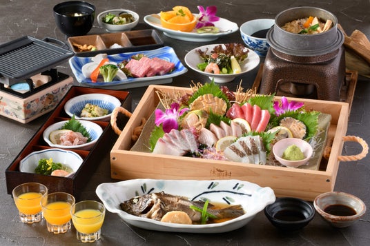 トロのような媛スマ、極上の養殖本まぐろ「だてまぐろ」、身のしまった鯛やふわっと仕上げたメバルの煮つけ、ブランド牛「伊予牛」の鉄板焼きなど料理長自慢の料理がお席を彩ります。