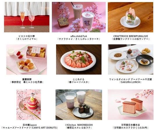 日本橋エリアの約240店舗が、“桜”をテーマにしたこの春限定のメニューを展開します。見た目も華やかなスイーツ、軽食、お弁当、ドリンクなど、春を味わうのにぴったりの品々をお楽しみください。