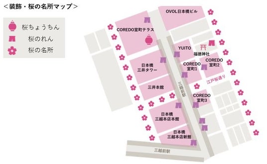 - 日本橋の春の風物詩「桜のれん」「桜ライトアップ」に加え、新登場の「桜ミニバッグ」「桜ちょうちん」など、街をフォトジェニックな桜色に染めるコンテンツが続々登場。昼と夜で趣の異なる日本橋の春を演出