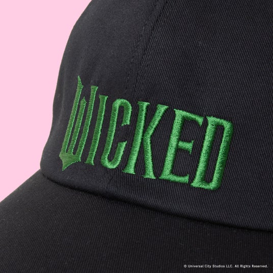 『WICKED』のロゴを刺繍したキャップ。作品のイメージカラーのグリーン×ゴールド、