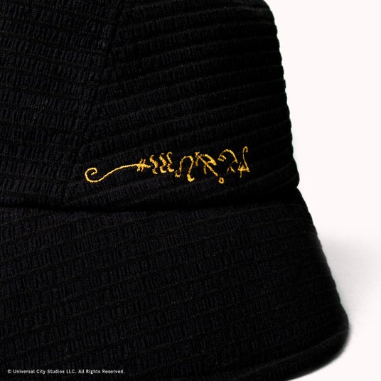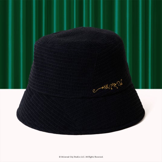 エルファバをイメージしたバケットハット。凹凸のあるテクスチャーと斜めに入れた切り替えで、エルファバが劇中でかぶっている帽子の立体感を表現しています。魔法の本「グリムリー」の文字で「WICKED」と書かれた刺繍がワンポイント。