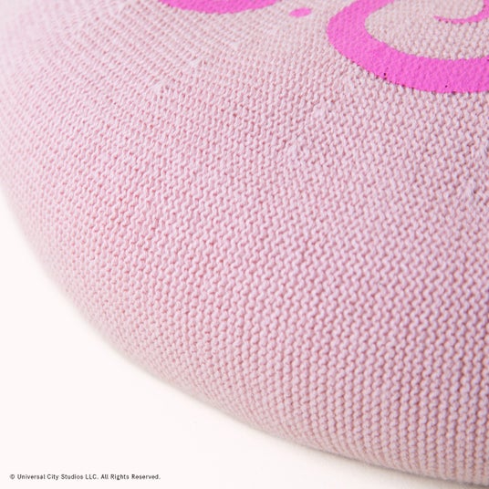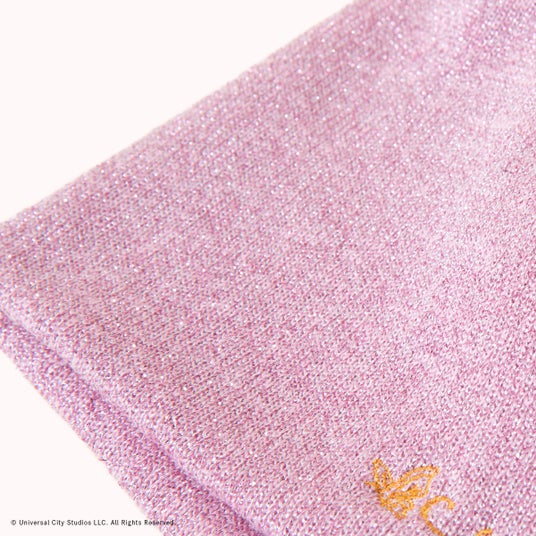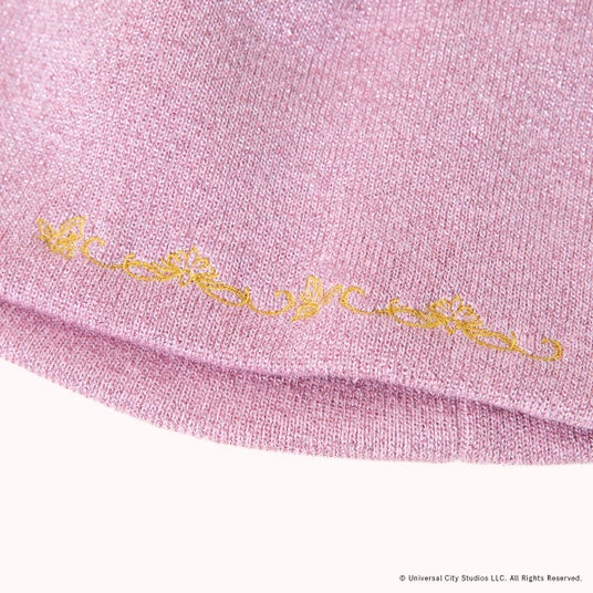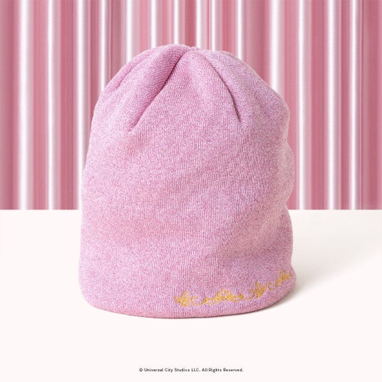 グリンダをイメージしたニットキャップ。ピンクのラメ糸を編み込み、グリンダのキャラクターのように明るく華やかに仕上げています。グリンダをイメージしてデザインされたモチーフの刺繍がワンポイント。