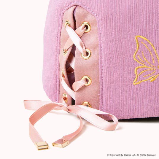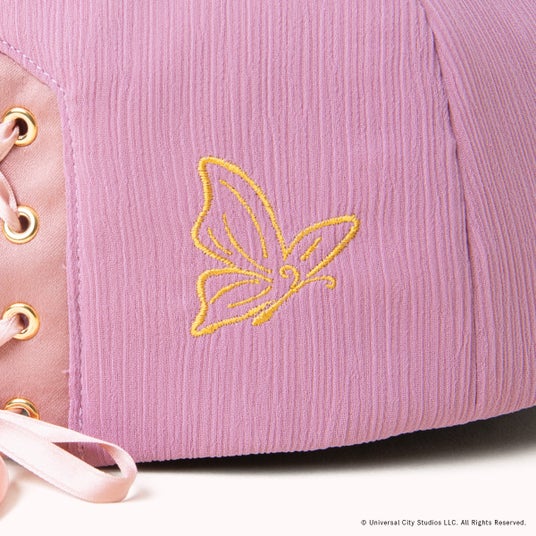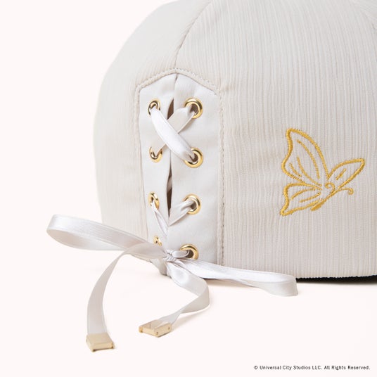グリンダをイメージしたキャップ。グリンダのドレススタイルから着想を得て、コルセットをモチーフにした編み上げのデザインに仕上げています。華やかさを引き立てる蝶の刺繍がワンポイント。