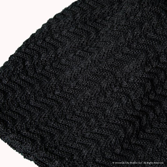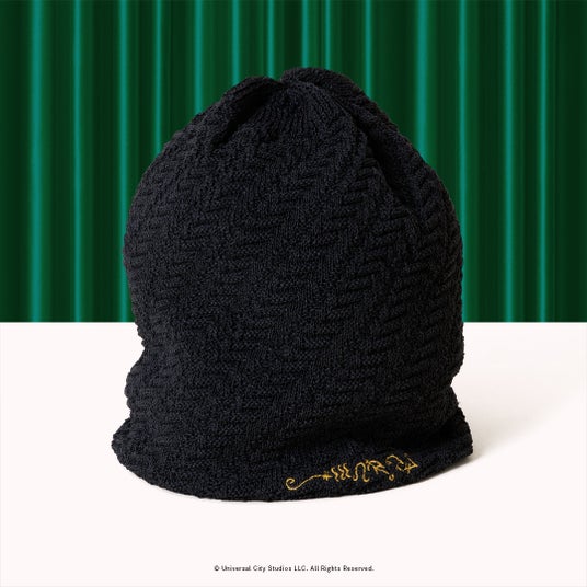 エルファバをイメージしたニットキャップ。らせん状に編み立てることで、エルファバが劇中でかぶっている帽子の立体感を表現しています。魔法の本「グリムリー」の文字で「WICKED」と書かれた刺繍がワンポイント。