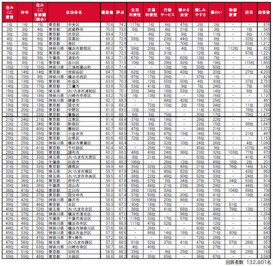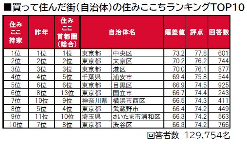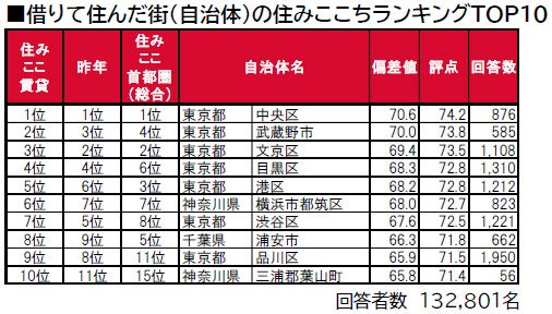 1位と2位は4年連続で、1位は東京都中央区、2位は東京都文京区です。3位は2年連続で東京都港区です。トップ3の自治体は、「住みここち<首都圏版>」でも同じくトップ3となる高い評価を得ています。トップ10には、東京都の自治体に加え、千葉県・埼玉県・神奈川県の自治体もランクインしています。