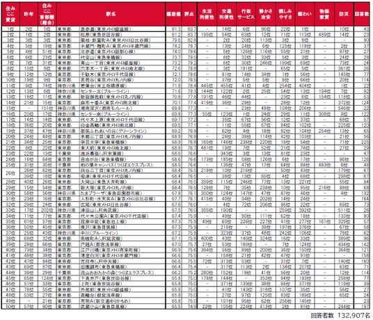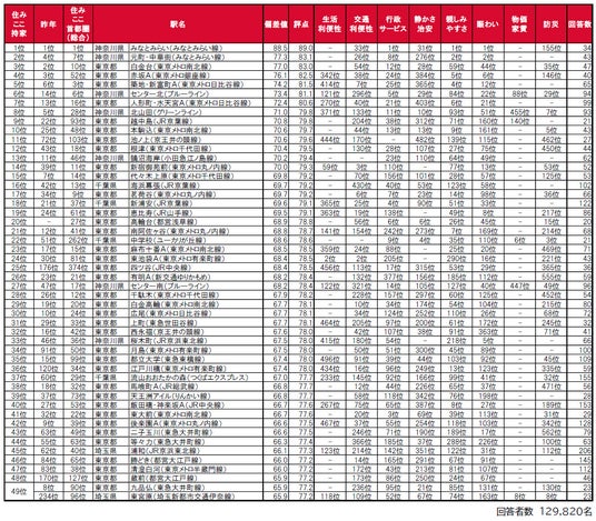 ●トップ2の駅は偏差値80台の極めて高い評価、3位~14位までの駅は偏差値70台の高い評価を得ています。また、15~50位の駅は偏差値60台で相対的に住みここちが良いという評価になっています。
