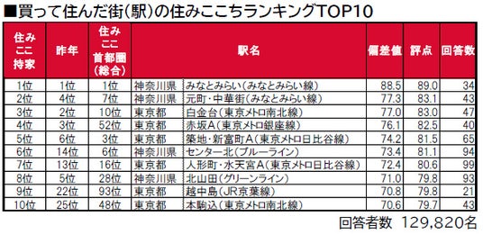 1位は4年連続で神奈川県横浜市西区に位置するみなとみらいで、唯一偏差値80台の極めて高い評価を得ており、「住みここち<首都圏版>」でも1位です。2位は神奈川県横浜市中区に位置する元町・中華街で、昨年4位から順位を上げました。トップ2は、みなとみらい線沿線の駅です。3位は、東京都港区に位置する白金台です。