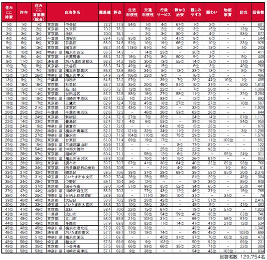 1位は3年連続で東京都中央区で、「住みここち<首都圏版>」でもトップの街です。2位は東京都武蔵野市で、昨年3位から一つ順位を上げました。3位は東京都文京区です。東京都の自治体がトップ5を占めています。