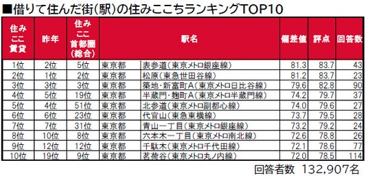 1位は東京都港区に位置する表参道で、昨年2位から順位を上げました。2位は東京都世田谷区に位置する松原です。3位は2年連続で、築地・新富町A(近接駅の築地・東銀座・築地市場・新富町を統合)です。トップ3は、「住みここち<首都圏版>」でトップ5に入っている駅です。