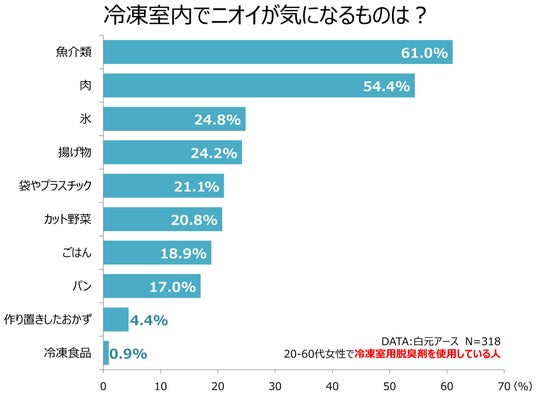今回当社が独自に調査したところ、冷凍室用脱臭剤ユーザーは、冷凍室内でニオイが気になる対象として様々なものを挙げていることが分かりました(下図参照)。