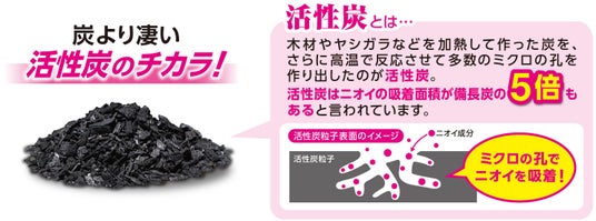 ●脱臭力に優れたヤシガラ活性炭をベースに、備長炭・竹炭を配合したトリプル炭処方!