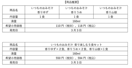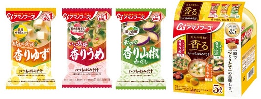 アサヒグループ食品株式会社(本社 東京、社長 川原浩)は、アマノフーズブランドの「いつものおみそ汁」シリーズから、『いつものおみそ汁 香りゆず』『いつものおみそ汁 香りうめ』『いつものおみそ汁 香り山椒』『いつものおみそ汁 香り楽しむ5食セット』を3月3日から発売します。