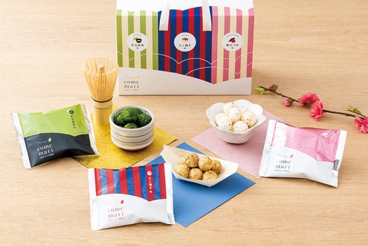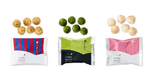 「comemari」は2023年4月に阪急うめだ本店にオープンした、米菓一筋120余年の実績と技術を活かして作り上げた、お米のスナック専門店です。鞠のように愛らしいコロッとした形に、サクッとしたふんわり食感。お米と相性の良い素材の豊かな旨味を存分に引き出した、大人にこそ食べて欲しい、あられの進化系スナック。個包装を詰め合わせたアソートセットは、手土産やフォーマルな贈り物にもお使いいただけます。