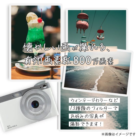有効画素数800万画素でカラーもヴィンテージ、白黒など様々なモード変更可能で撮った写真をWiFi機能を使ってスマートフォンへ簡単コピー。