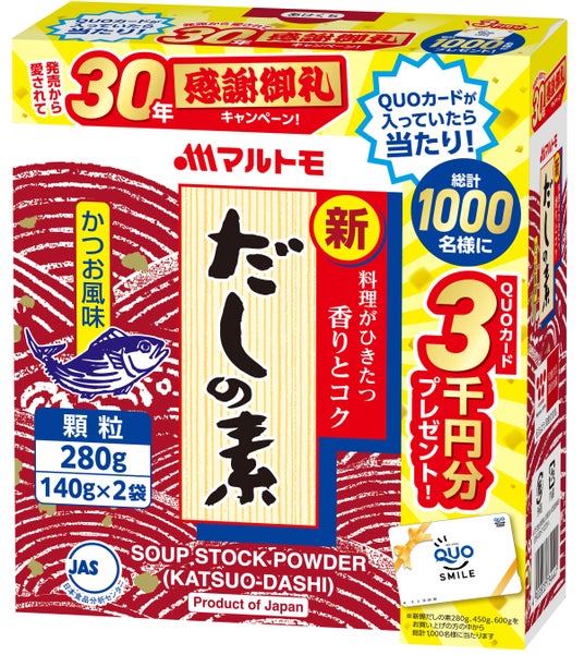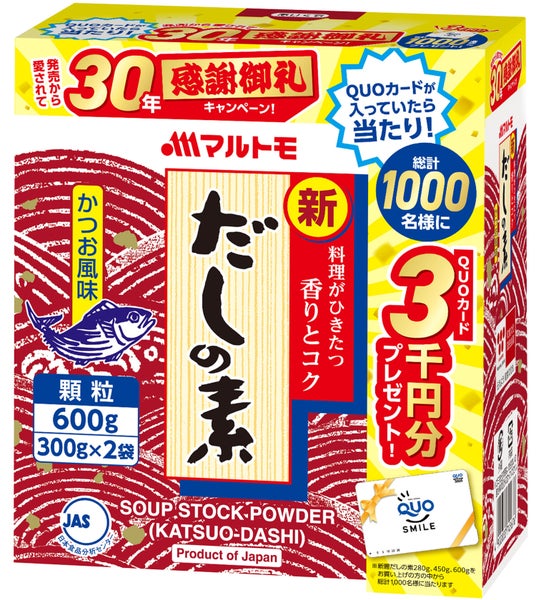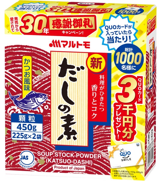 かつお節・だしと、海洋資源を通じて健康と食文化の発展に貢献するマルトモ株式会社(社長:今井均 本社:愛媛県伊予市)は、これまでのご愛顧に感謝し、発売中の「新鰹だしの素280g」、「新鰹だしの素450g」、「新鰹だしの素600g」を対象商品として「発売から愛されて30年感謝御礼キャンペーン」を実施いたします。