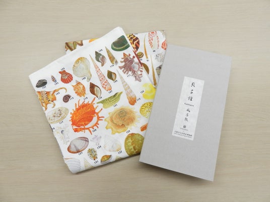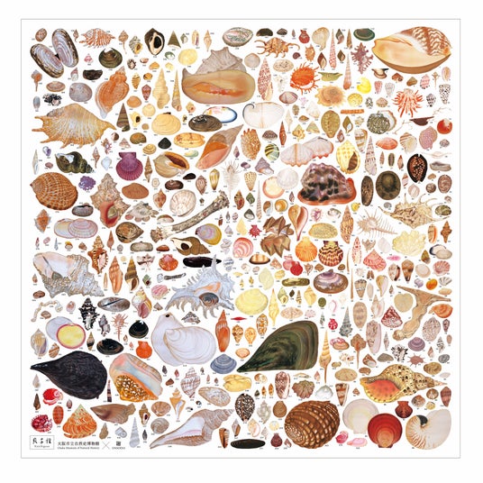 日本の近代貝類学の発展に大きく貢献した平瀬與一郎。平瀬が刊行した「貝千種」(かいちぐさ)は、多色木版画を和装した美しい貝類図鑑です。今回、特別展の開催にちなみ、美術専門出版業の芸艸堂と大阪市立自然史博物館がコラボ。「貝千種」に掲載された全400種の貝を一枚に敷き詰めた風呂敷を制作しました。400種の種名、学名、産地を記載した解説パンフレットも同封。多様な形、色彩を持つ貝の華やかさと迫力をご堪能ください。