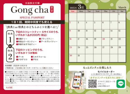 本誌の限定付録は、1日1回・期間中何度でも使える特典がついたスペシャルパスポート。ストレートティーやトッピングをお得にご利用いただけます。ゴンチャを知り尽くしたクルーが、おすすめドリンクやカスタマイズをたくさん紹介しているので、ぜひこの機会に新しいドリンクやカスタマイズにチャレンジしてみてはいかがでしょうか。