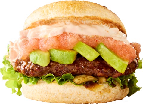 国産小麦と全粒粉を使用したふんわりバンズに、スパイシーな香りが食欲をそそるジューシーな植物由来のオリジナルパティや食べ応えのあるアボカド、シャキシャキ野菜をサンド。タルタルと明太子の淡いピンク色と野菜の緑色が組み合わさりコントラストが映える、見た目にも春らしい和バーガーです。