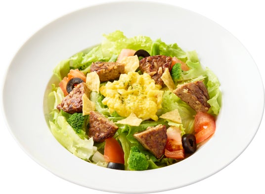 春季限定メニューと同日、サラダに新メニューが登場。トマトやブロッコリーなどの野菜に、植物由来のジューシーな2foodsオリジナルミニハンバーグ、プリッと食感の植物由来たまごフィリング「Ever Egg」※5を同時に味わえる食べ応え抜群のサラダ。オリジナルシーザードレッシングは、植物由来なのに濃厚でクリーミーな味わいで、一皿でも満足感のあるシーザーサラダです。