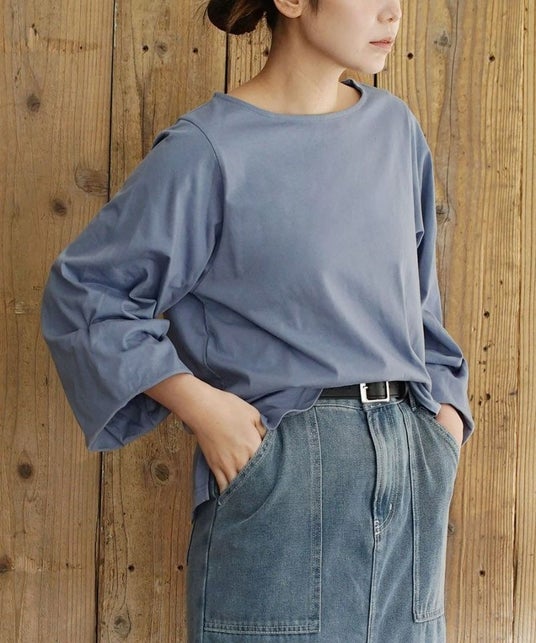 ほどよい厚みのカットソーだから「ラクなのにきちんと」が叶います(スタイルアップ デザインスリーブ カットソー[七分袖]アッシュブルー着用)