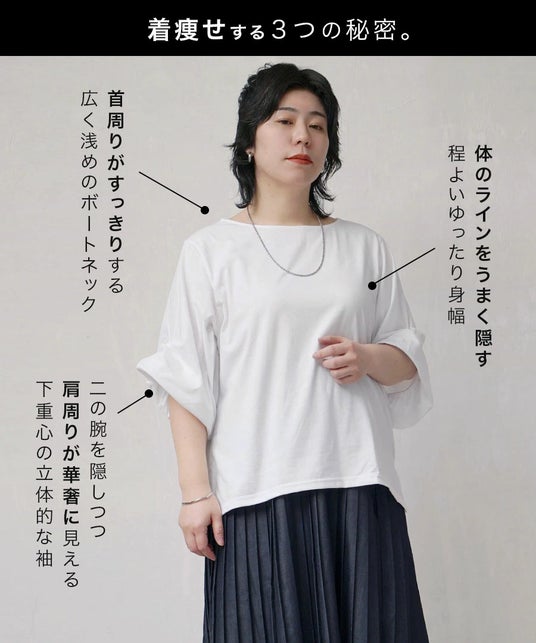 体型を気にせず春夏のおしゃれを楽しめます(スタイルアップ デザインスリーブ カットソー[五分袖]オフホワイト着用)