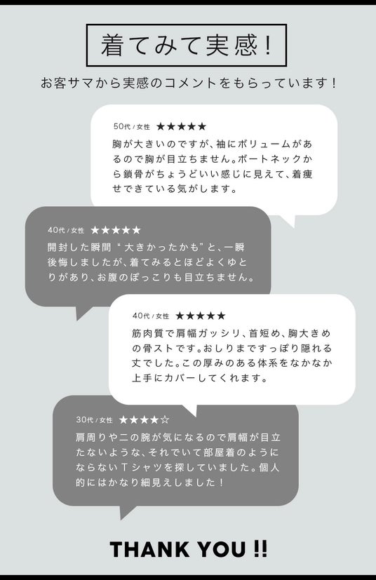 株式会社ステップワールドが実施したアンケートによると、体の中で最も気になる部位として「お腹まわり」が58%を占め、第1位という結果に。「スタイルアップデザインスリーブカットソー」は、気になりやすいお腹まわりをすっぽりとカバーできる特別な設計。さらに「胸の大きさが気になっていたけれど目立たなくなった」「おしりをうまくカバーできる」「肩回りや二の腕が華奢に見える」といったお声をいただくなど、さまざまな体型の悩みに応える工夫を施した優れものです。