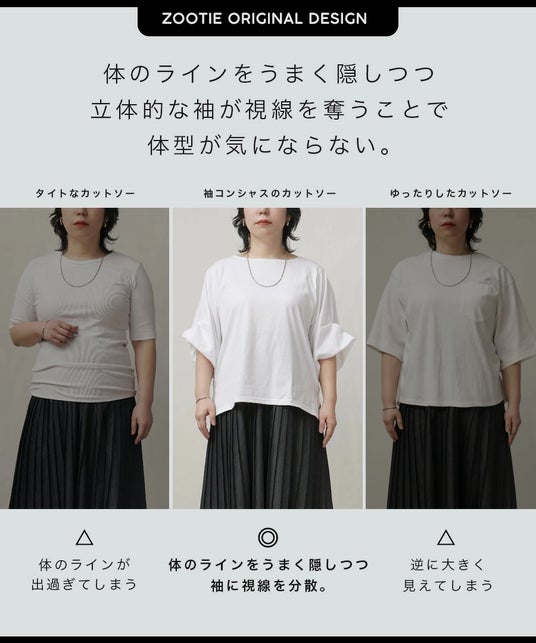 「ただ体型を隠す」のではなく、「体型を隠しつつ着やせを叶える」カットソーです