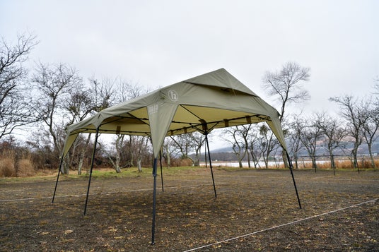 人気NO.1 HIDEOUT-02(ハイドアウト02)4.8m×7.6mの大型幕ながらも設営が簡単で、四隅をペグダウンして2本のポールで立ち上げればほぼ完成。