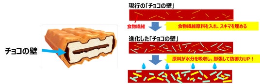 水分からのバリアーの役割を担う「チョコの壁」に食物繊維原料を入れ、モナカを水分からより防御できるよう改良しました。