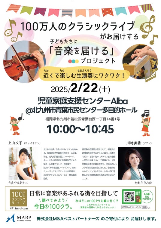製造、建設、不動産、医療・ヘルスケア、物流、ITに特化したM&A仲介を行う株式会社M&Aベストパートナーズ(本社:東京都千代田区、代表取締役社長:齋藤 達雄 以下M&Aベストパートナーズ)と、一般財団法人100万人のクラシックライブ(東京都千代田区、代表理事:蓑田秀策 以下100万人のクラシックライブ)は、2月22日(土)10:00~より、北九州市青葉市民センターにて、クラシックライブを開催することをお知らせいたします。