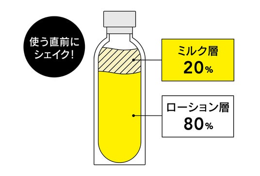 ボトルを振って2層を混ぜると、まろやかなミルク化粧水に変化。肌にスッとなじむテクスチャーで、角質層にぐんぐん浸透!美容液成分*⁸を肌のすみずみまで届け、ぷるんとしたハリのあるもっちり肌へ仕上げます。